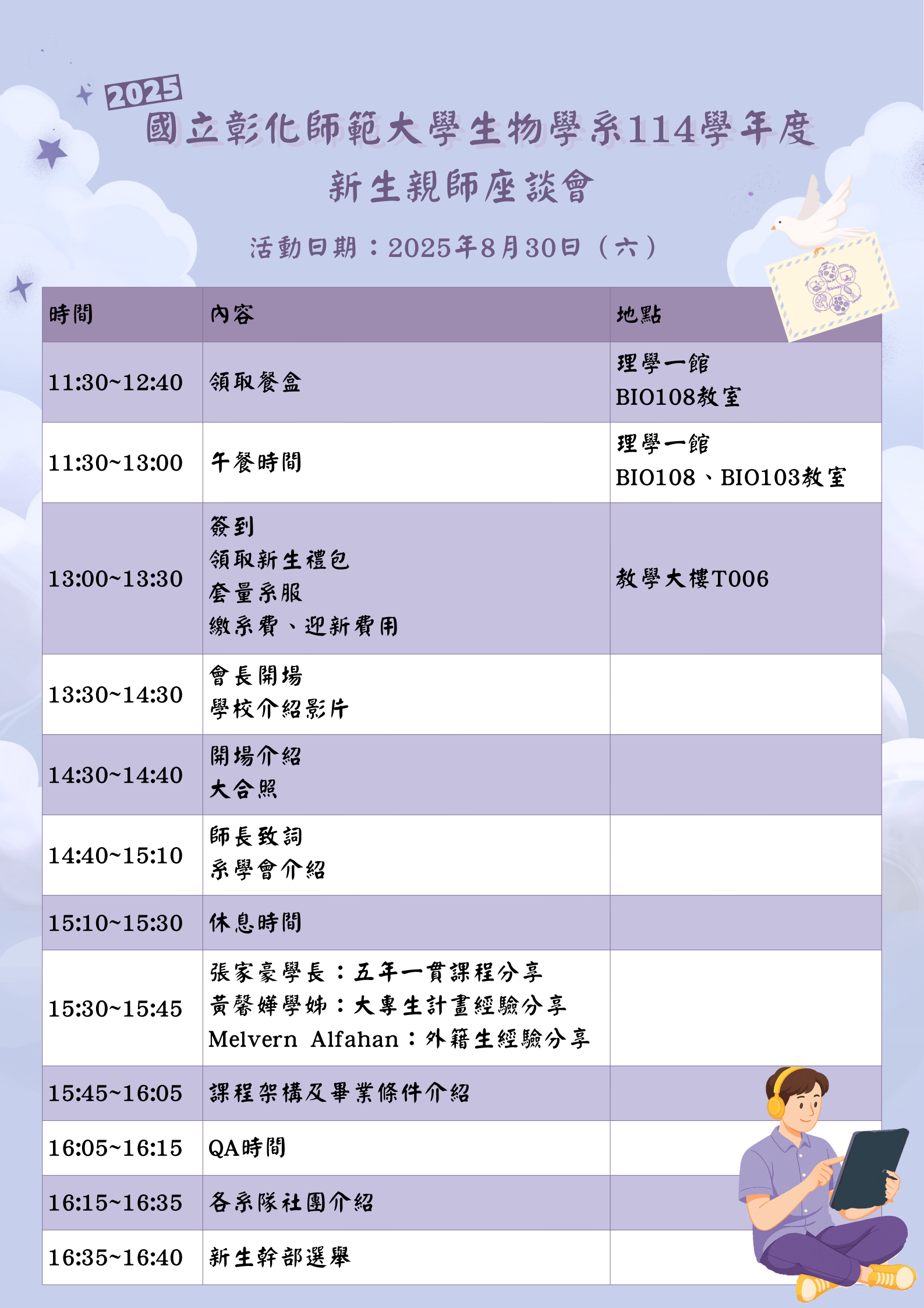 日期:114年8月30日(六) 午餐時時間11:30~13:00 地點:理學一館BIO108教室 新生家日長親師時間1:00~1:30簽到 地點:教學大樓T006教室 時程表如附圖